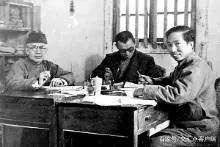 1938年,吴克坚任《新华日报》总编辑,他将刊物作为阵地公开宣传抗日救国方针。图为1939年,吴克坚与熊瑾玎(左一)、潘梓年(中)在重庆《新华日报》社办公室